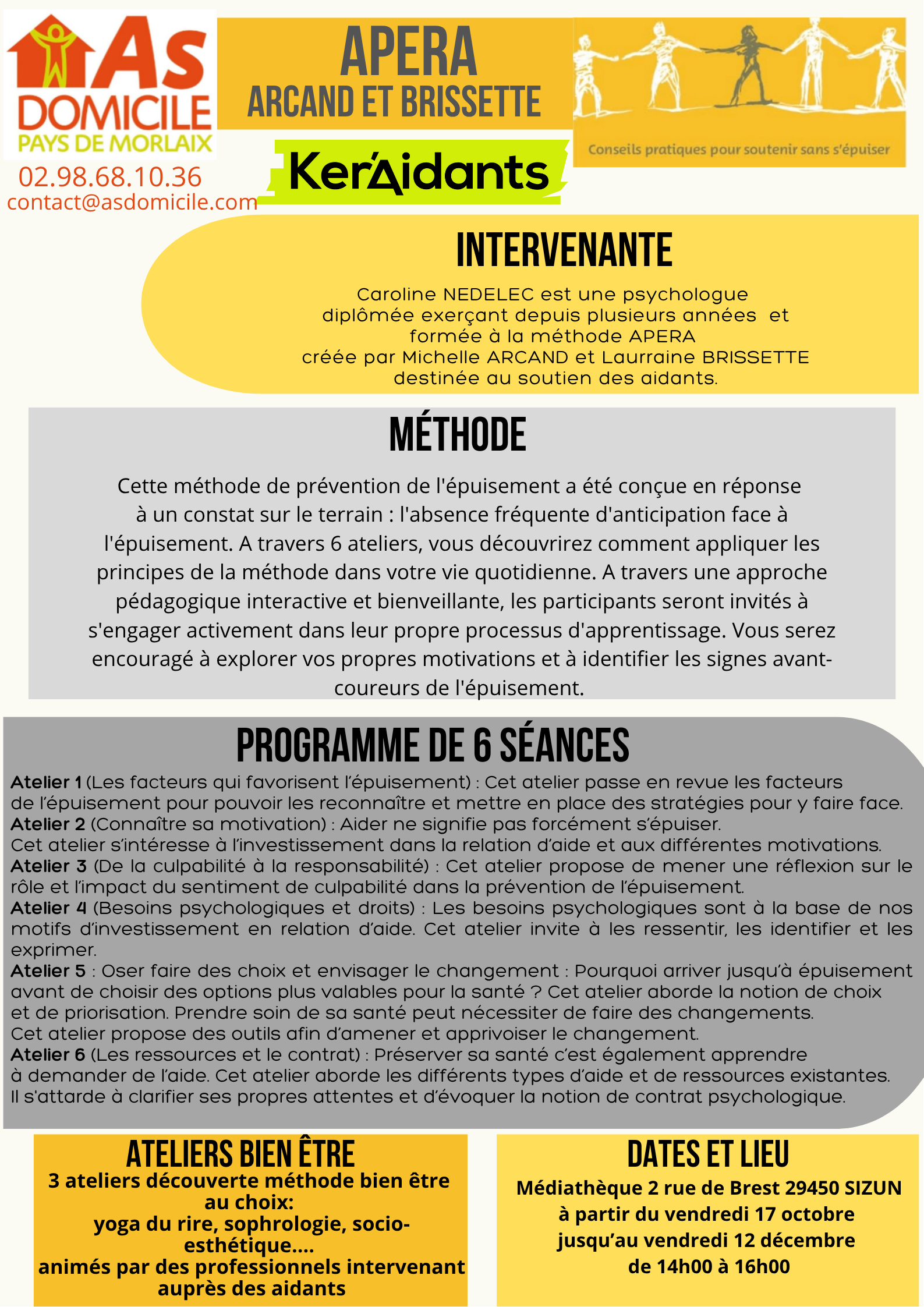 Conférence découverte de la méthode APERA : Approche de Prévention de l’Epuisement en Relation d’Aide, animée par Caroline Nedelec, psychologue. Cette approche basée sur l’apprentissage de la gestion de l’énergie permet à tout à chacun de s’engager dans une démarche de changement pour la protection de sa santé.